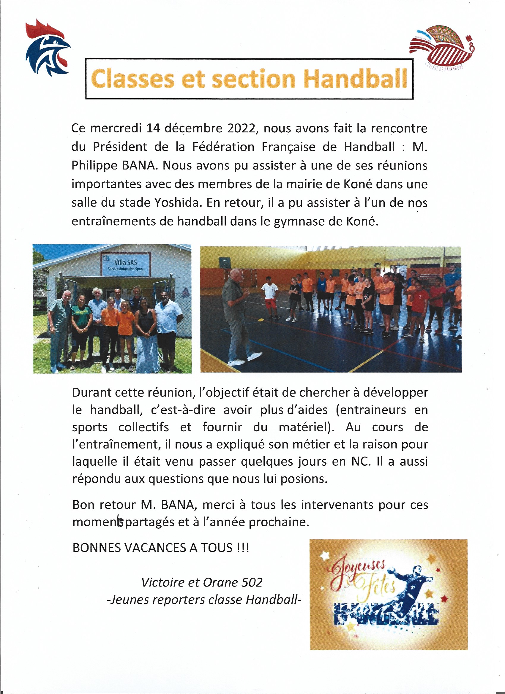 Voici la liste des 51 Handballeurs pour l'année 2024 : 6ème : Lewis, Bryan, Arthur, Eloa, Julien, Khalil, David, Margaux, Célya, Gabriel, Norah, Aldric, Kévyn, Joackim, Kurtis, Alonzo, Jaïc, Florineda 5ème : Maël, Enzo, Vainui, Raphaël, Kémuel, Kimany, Nadège 4ème : Nahyra, Phaëlla, Evangéline, Cédélya, Yolane, Louis, Krys, Lorencia, Nolan, Luka, Lydia 3ème : Dharuna, Marie, Henzo, Louhan, Teariki, Lovaïna, Mahira, Victoire, Maël, Charlène, Reyna, Abigaëlle, Jade, Ely, Orane Nous vous souhaitons d'agréables vacances et vous donnons rendez vous en février pour une année "Handballante"