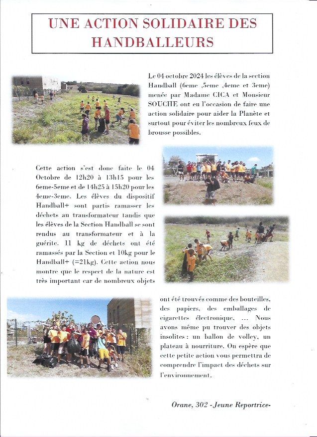 Ce vendredi 4 Novembre, les élèves du dispositif Handball ont participé à une action solidaire autour de la gestion des déchets aux alentours du collège.